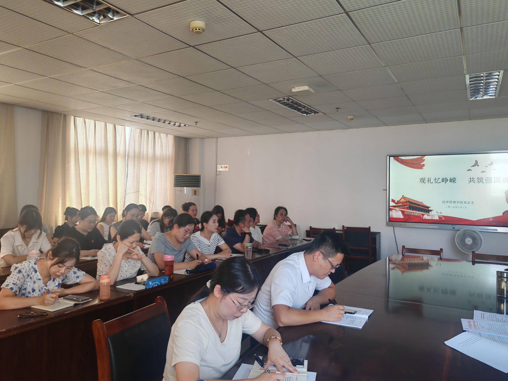 9月3日,经济管理学院党总支召集全院教职工开展纪念中国人民抗日战争暨世界反法西斯战争胜利80周年专题学习交流会议,深入学习领会习近平总书记重要讲话精神,铭记历史荣光,汲取奋进力量。会议由党总支书记贾书媛主持。
