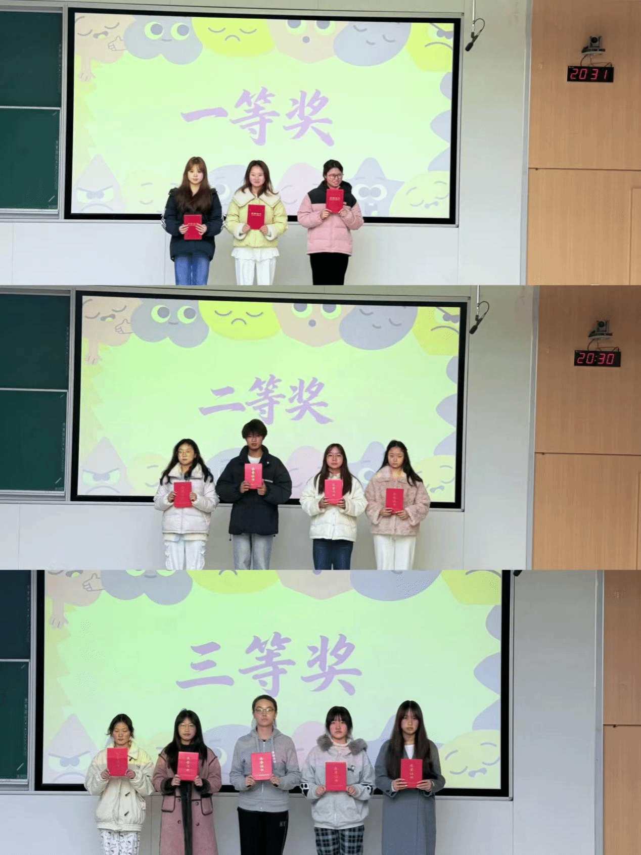 经评选,商务2501、幼管2502、幼管2501获一等奖,直播2502、物流2502、商务2502、会计2504获二等奖,直播2503、直播2501、物流2501、研学2502、会计2503获三等奖。