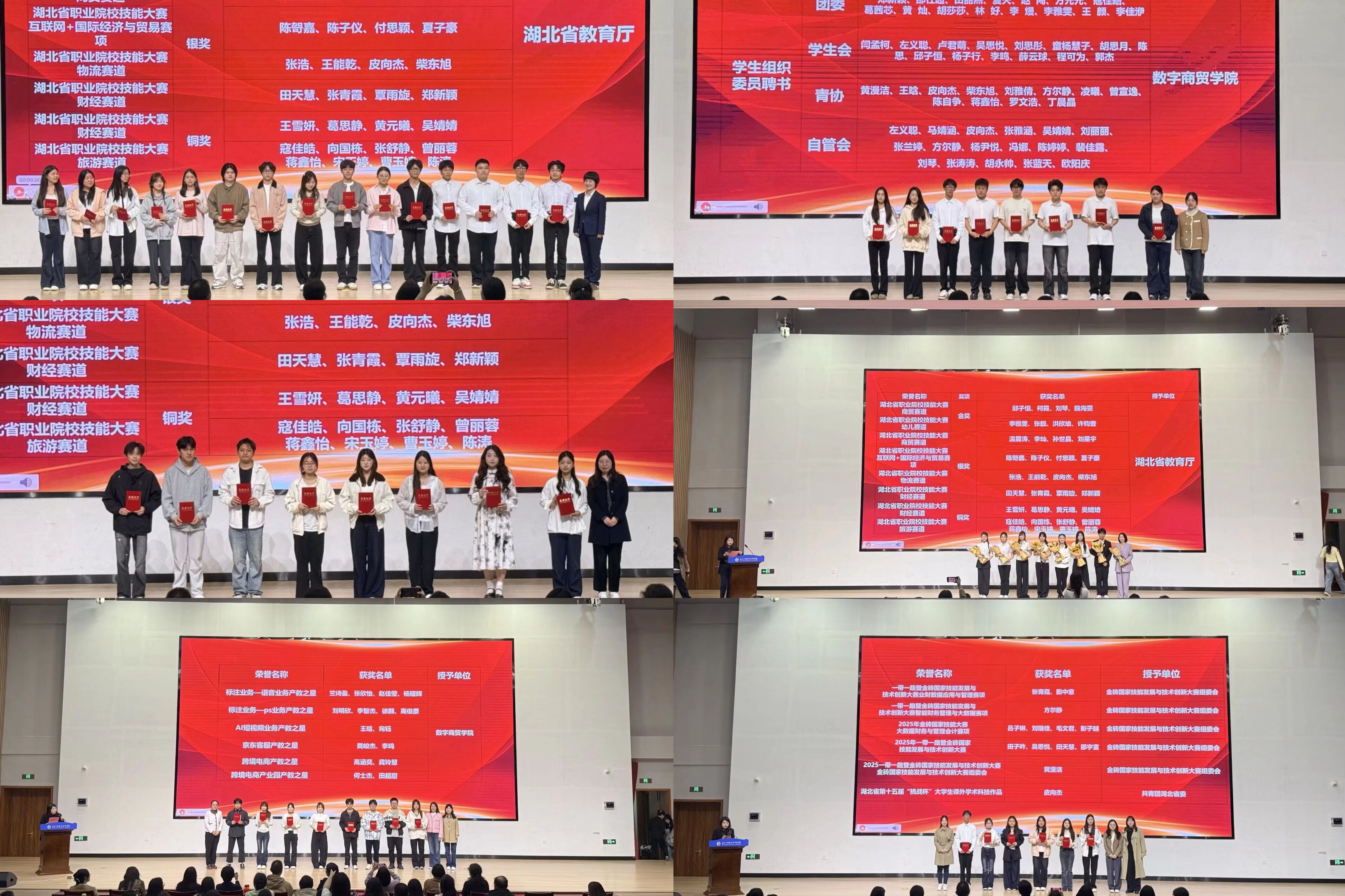 随后,学院依次表彰了优秀学生干事、产教之星、学科类竞赛获奖学生、社会实践优秀团队、行业竞赛获奖学生及湖北省职业院校技能大赛获奖学生等。营销2401班柯霞、物流2502班吴少穷作为获奖学生代表发言,分享成长感悟与奋斗历程。
